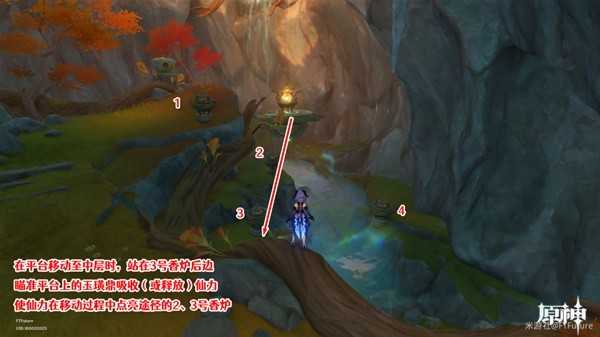 之后站到2、3号香炉后面,在移动平台移动至中间时,按T吸收(或释放)仙力,仙力在移动时就会点燃途径的2、3号香炉。
