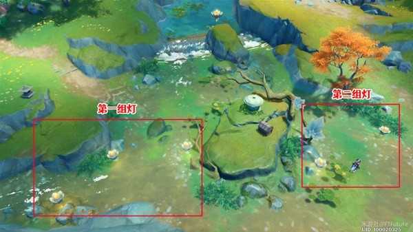 1. 角色自身携带流莲盏,站到其中一组灯旁边,点亮后快速跑到另外一组灯旁,点亮剩下的灯;
