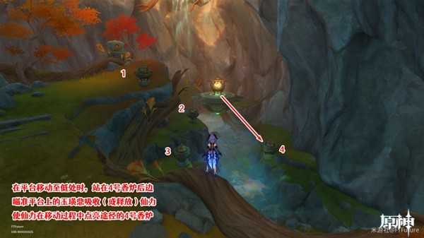 最后站到4号香炉后面,在移动平台移动至最低处时,按T吸收(或释放)仙力,仙力在移动时就会点燃途径的4号香炉。