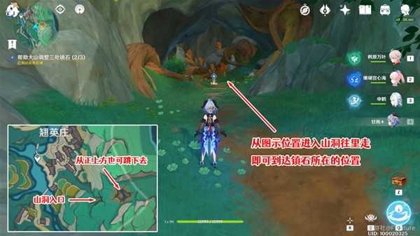 镇石3位于一个山洞中,可以从下图所示位置的入口进去,也可以走到正上方跳下去。
