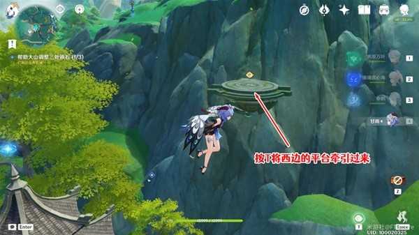 飞起来以后往西边看,按T运用仙力,将平台牵引过来,之后飞到平台上。