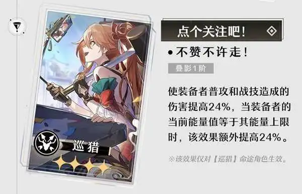 光锥「点个关注吧」在叠影5后能提供48%的普攻战技增伤,在角色满能量时额外提供48%的普攻战技增伤。