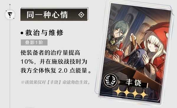 但该效果的叠层难度很高,装备者为我方目标提供治疗时才能叠1层,目前的丰饶角色中除了藿藿天赋的【禳命】和罗刹天赋的【白花之刻】外,其余丰饶角色的治疗频率并不高,基本无法叠满效果,因此该能力仅适合藿藿和罗刹。