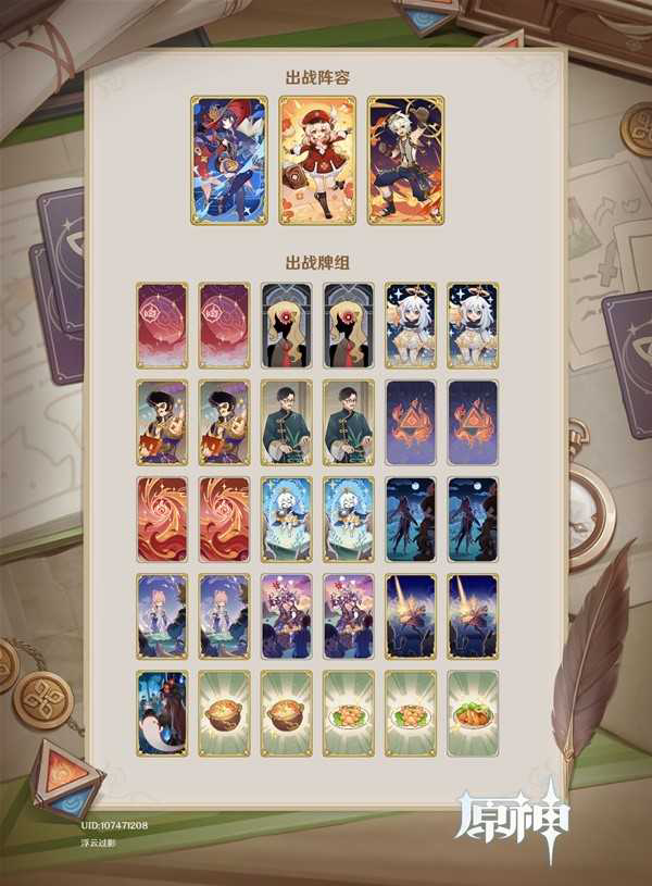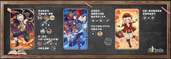 这套牌核心还是依赖班尼特的超强大招buff的加持上运行的,所以前期蓄爆,第二回合开出大招后依靠高额加伤以及回复给对面挂火,再切制莫娜打出蒸发并挂水,最后可莉收割即可,卡组图片思路如下图