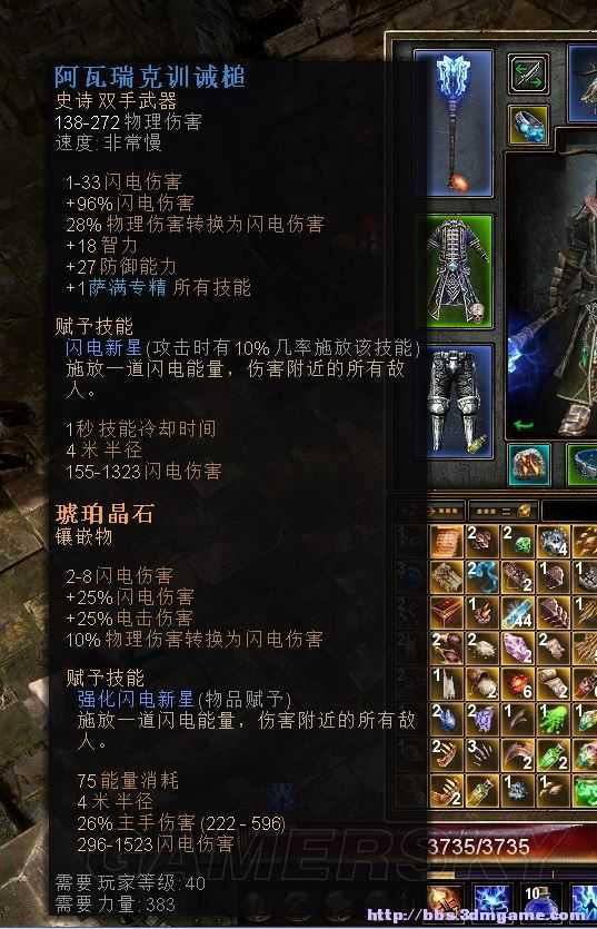如果没有好武器的,建议去痛苦阶梯最后大boss打一把刀,之前一直用,忘了叫什么。一直用到40级。虽然没有闪电伤害加成,但dps也很高,砍怪秒秒的。,还给个瞬移的技能。