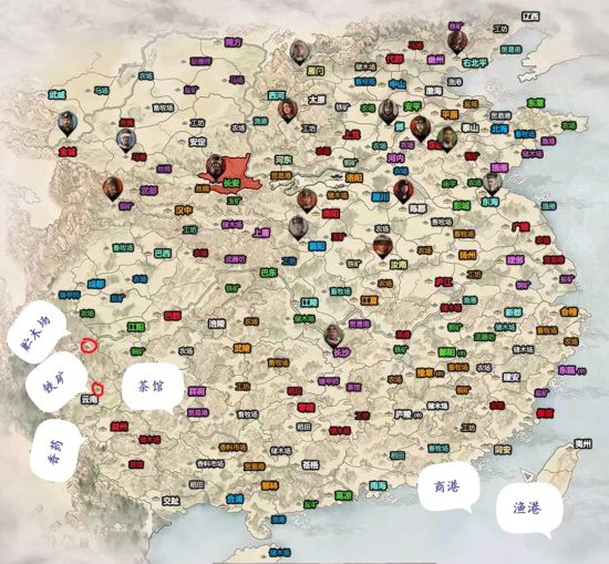 郡县名为白色的表示大城自带港口,县字体为绿色表示农业产值,黑色为工业产值,蓝色为商业,红色为特殊资源或多种类型产值。