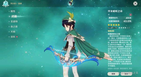 武器选【终末弓】,可以选输出型的【天空弓】、【冬极白星】、【绝弦】、【暗巷弓】,或者充能型的【祭礼弓】、【西风弓】等。圣遗物选“风伤4件套”,主属性为攻击沙、风伤杯、暴击帽。实际游戏中,温迪必须在前台触发“风伤4件套”的效果,后台无效。