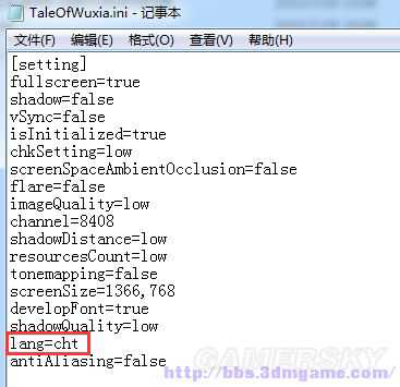 简/繁体游戏语言设置:找到侠客风云传游戏目录Tale of Wuxia\launch下的TaleOfWuxia.ini并打开,如下图所示: