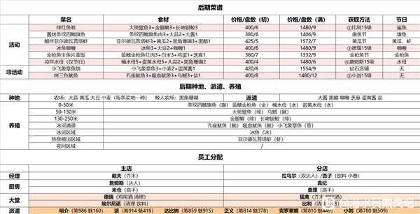 另外①②③④序号代表的是员工升级的优先级,我把员工分配和菜谱放到一起了 方便看。