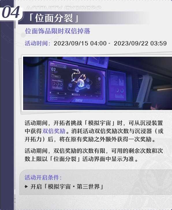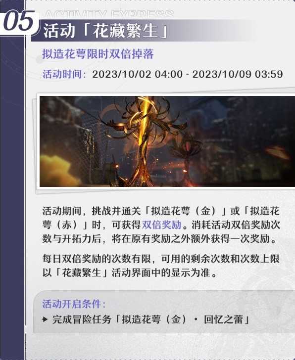 正文 《崩坏星穹铁道》1.3版本下半活动一览 闪亮小编 /2025-04-22 18:43:10 /31 浏览量 0422 《崩坏星穹铁道》1.3版本即将迎来后半部分的内容,想要了解下半有哪些活动玩法的玩家请看下面官方带来的《崩坏星穹铁道》1.3版本下半活动一览,希望能够帮助大家。 灵雨既零,命彼倌人。 -- 展开阅读全文 --