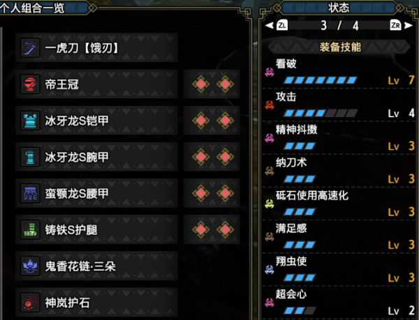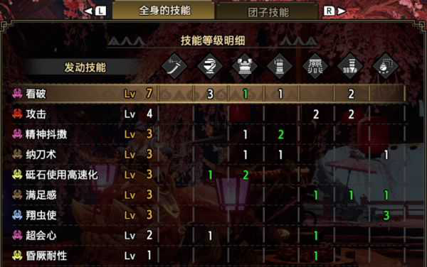 护石是翔虫2纳刀1S31,也不算太好吧。原理把弱特换成翔虫使,樱花基本也打不动弱点,所以就换掉弱特。