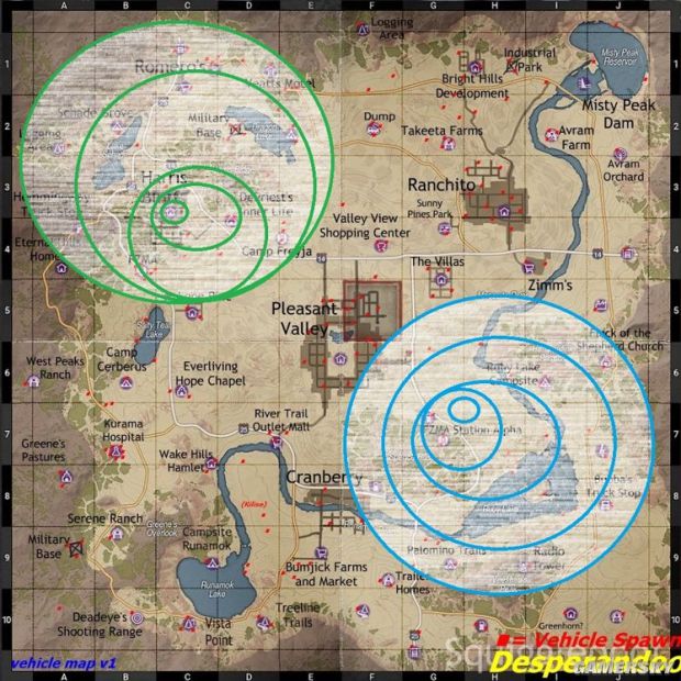(图二)降落地点/起始位置,黑色圆圈,恭喜抽到轻松场!红色圈代表,高压场(抢不到车请烧香)!