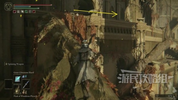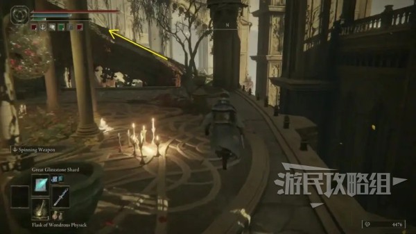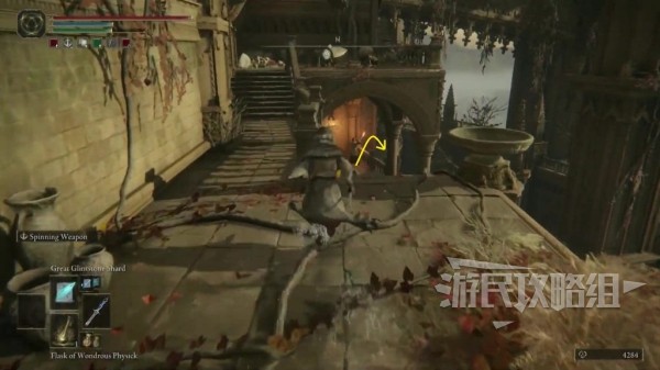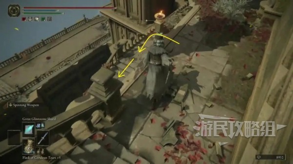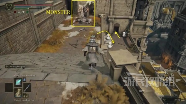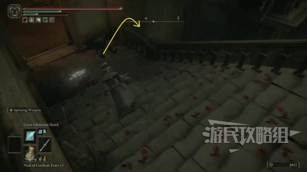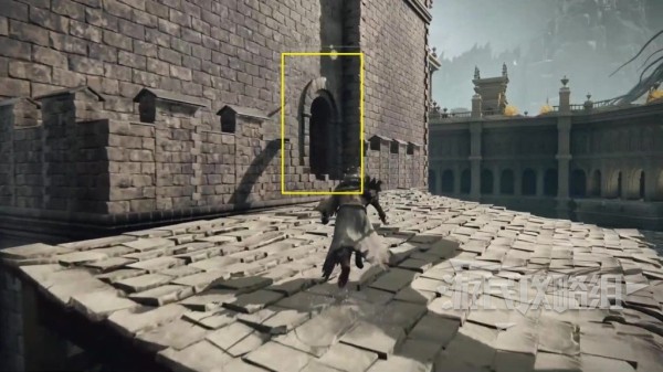 出门后直行,来到楼梯的岔路处,从右边楼梯下去,走到尽头时从右边跳下去。