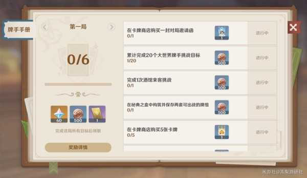 牌手手册:类似一个新手教程一样的东西,目的是为了给出一些指引,引导玩家去体验七圣召唤的各种内容,每一页是60原石。这种要肝的内容,后面难度如何不好说,但至少第一页挺简单的,姑且就当3.3版本摸鱼你只完成第一页吧。