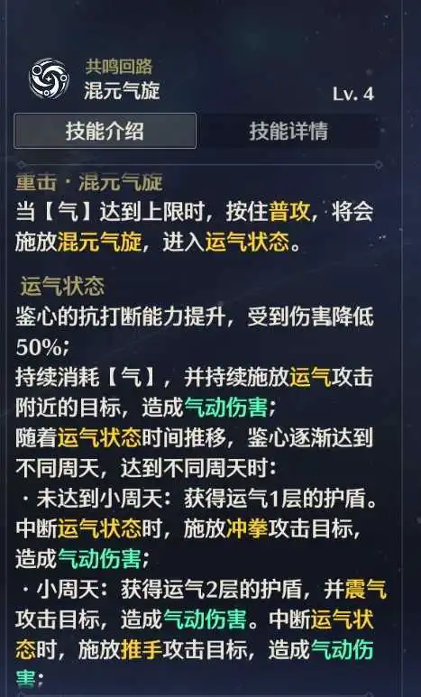 释放共鸣技能后,进入【架势姿态】,也就是格挡状态,格挡状态持续时间内,受到伤害会免疫此次伤害并进行伤害更高的【行气反击】,如果自行解除格挡状态或者格挡期间没有受到伤害强制结束会释放【降气反击】,从倍率方面来看,【行气反击】大约比【降气反击】倍率高30%左右,实战中更多的是用来抵挡一次伤害。