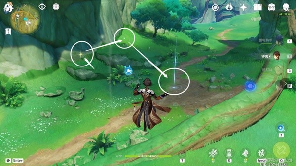 往地图的西北方向走,在图中的石堆位置,获取第一处能量