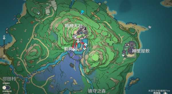此处位于鸣神大社旁边的大洞窟中,从上面传送锚点跳下去即可