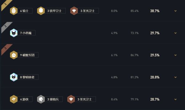 好了,我们再回归到当前版本的运营阵容里面,根据官方大数据可以看出当前版本吃鸡率最高的依然是我们的天使阵容。小嗨在版本更新前已经预测了天使虽然被小削弱,但是丝毫不会影响她T0的位置,只要有2星天使+6骑士/4秘术基本就是必吃鸡的局面!