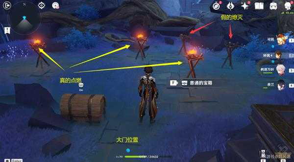 11.按照下图,用火元素,点燃3个火把,另外两个用水元素熄灭,即可获得普通的宝箱。