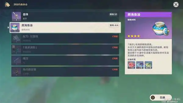 原海鱼油作为「竭泽」的精炼材料,在武器兑换结束后,继续搜集所需鱼类兑换鱼油来精炼「竭泽」