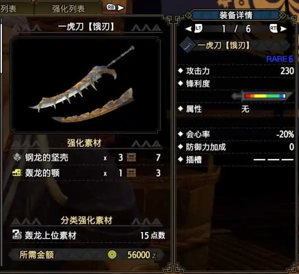 武器选用的是轰龙太刀,相对攻击较高,短白斩,会心率是负会心20%,属性无。选用的理由是攻击偏高,另一个理由是铁丝虫强化收益,但制作武器中需要注意。
