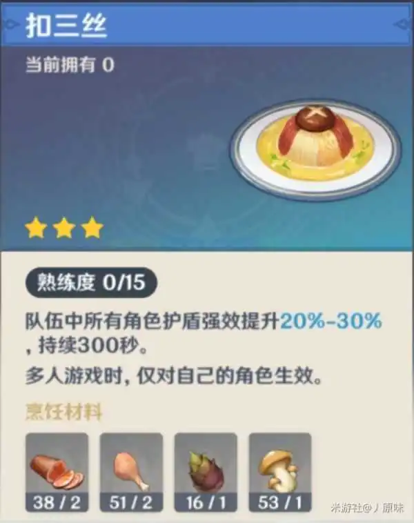 想学厨艺得先获取秘方才对,我也不少做过黑暗料理,所以此游戏关于后厨方面给玩家带来许多方便之处呢。好,废话不多说,你们听说过[扣三丝]吗?巧了我也只是听说,并没吃过,hhh。简单来说就是碗底加一株元气满满的香菇,再放入火腿丝、竹笋丝与煮熟的鸡胸肉丝,并拼成碗型然后塞满内部,烹饪一番倒上本调好的鸡汤,就如同图片堡垒一般(口水四溅),咳咳,其三者食材最为重要的一种便是冬笋啦,竹笋本就是神秘又偏僻的食材,所有爱者传承五花八门的厨艺也就是纪念家乡的味道。所以大家还需知道采集竹笋的位置,那么这样的一款人间美食俗称为[扣三丝]。食谱可在璃月港[万民堂]卯师傅菜店购买,售价5000。