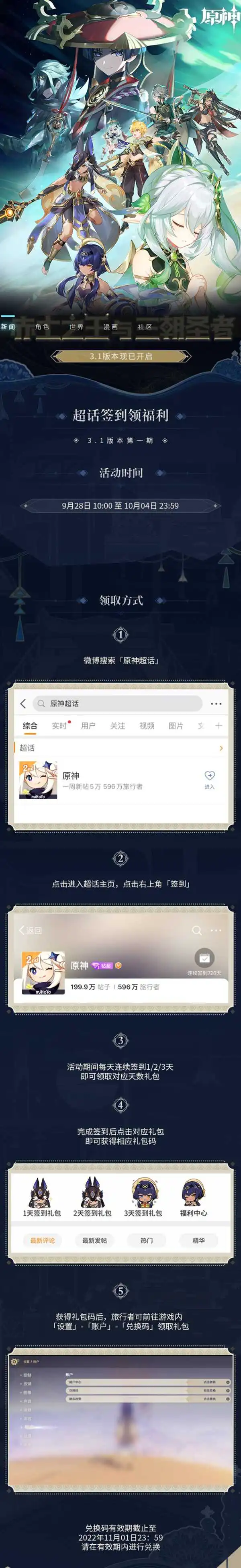 活动期间,在#原神超话#内连续签到1/2/3天,即可领取并在游戏内兑换对应天数礼包。