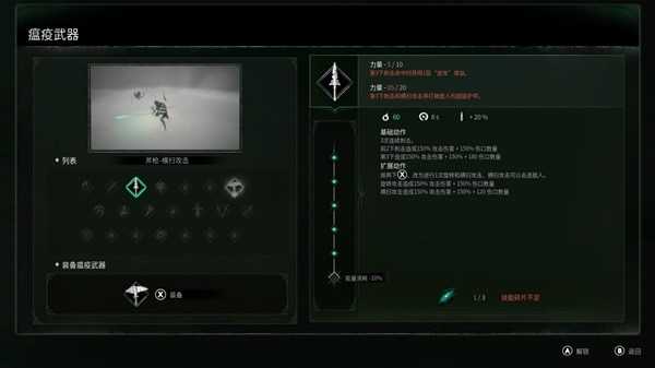 尽管羽毛、利爪、匕首和军刀已经形成了一个完整的战斗逻辑,不过游戏中还是存在一些多样化游戏体验的元素,那就是瘟疫技能——瘟疫技能有两种获取方式:首先用利爪处决绿血条打空的敌人可以获得一个一次性的瘟疫技能,好处是可以无消耗释放。其次是击杀敌人时会随机获得技能碎片(精英和BOSS敌人固定掉落),3个碎片就可以解锁对应的瘟疫技能,然后可以永久使用,但是需要消耗能量,越强力的技能消耗越大,比如第一个精英怪的大锤技能附带霸体、减伤和AOE大伤害+硬直,但是需要100能量,而初始上限仅有150。那么如何应对能量消耗的问题呢?
