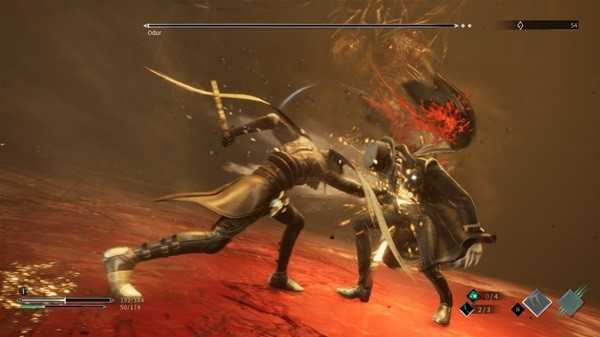 围绕着白绿双血条,除了“鼓励进攻”这一点以外(打掉白血条不及时追击就白打了),游戏首先做了一套比较特别的韧性机制:那就是敌我双方都存在一个隐藏的“反击条”——受到攻击会被打出硬直,但“反击条”蓄满以后会进入一个短暂的霸体期,所以一方面主动进攻是必要的,另一方面也不能无法一直攻击。那么当敌人进入“霸体”反击状态以后,是该翻滚闪避,等待自己的回合到来么?