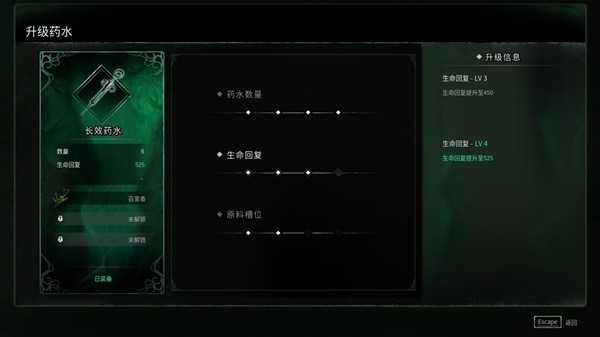 除了瘟疫技能以外,另一个重要的养成内容是药剂——游戏中包含了普通、慢回和快速三种药剂,每种药剂都可以使用炼金术士药剂(每个精英怪在首次击杀时掉落,也暗示了他们的身份)来完成升级,来增加回复量、药剂数量以及添加剂(额外的效果,包括回能量、血量和减伤、增加伤害等)。看起来在5秒内回复150%的慢回药剂是性价比最高的,但它的问题在于使用到生效是真的很慢(生效前动作可以被打断),而且在危机时可能来不及救命(回复的速度也慢),很多时候一半血就开始喝药,又会回不满应有的效果。而看起来最“亏”的快回药剂在开放足够的添加剂位置以后,也能够用炼金材料来改善回复量过少的问题。所以根据自己的加点方向,也可以选择培养不同类型的药剂(手残的话还是建议主点血量和慢回药剂了)。