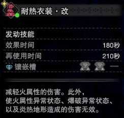 比较推荐这三件,衣装在做完对应任务后可解锁珠子孔位,自行根据对应攻略解锁即可。转身衣和铁衣可以插炮手珠[1]打场地武器,耐热衣可以插两颗重击珠带破坏王,提高部位破坏效率。