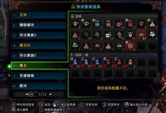 2、秘药[苦虫+蓝蘑菇+蜂蜜+曼陀罗(植生研究所优先种植4样)]、远古密药[铃鹿的角+滋养萃取液]。黑龙的伤害即使一身黑龙套去打,在精灵加护不生效的情况下一般也是吃不住两下的,碰到个别招式更是一下秒杀,所以维持自己的血量健康十分重要。回复药的使用速度慢、回复量不高,不安全的同时还会错失很多输出机会,所以建议大家不只是打黑龙要带,在打后期几只高难怪,包括但不限于煌黑、历战王冰咒、黄金奖杯等,道具袋中秘药调和素材尽量带满;