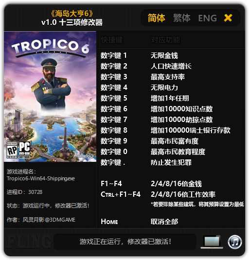 简体、繁体、English,可以切换语言 (切换语言后修改器将把该语言设置为默认语言)。