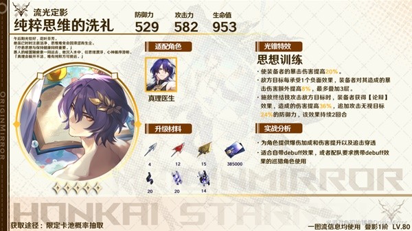 【纯粹思维的洗礼】能提供暴伤、增伤、无视防御三个乘区的加成,与其他队友配合的情况下能与其他光锥拉开较大差距,是真理医生光锥选择的最优解。