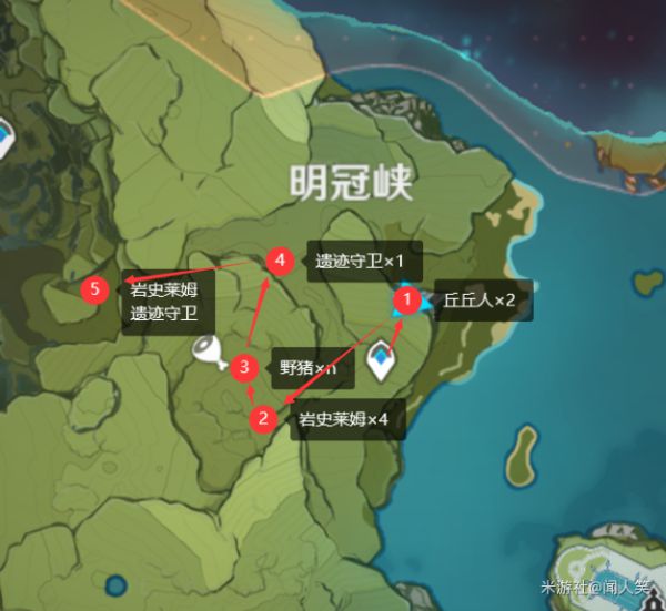 1.从红色箭头所指传送点,前往①,来到悬崖边缘,此处有三个丘丘人。(其中一个红色外表手拿弓箭,先快刀斩之)
