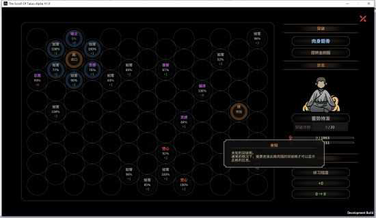 太吾中门派功法类的武功都在练功房(开局的竹庐也可以)研习,技艺的书需要去各类型的建筑研习。修习功能要讲的不多,相对于突破修习可能获得的进度更少但是更省历练,而且功法越高阶,就有越多门槛需要突破之后才能继续修习。按住拉杆那个按键可以猛加进度,当心用力过猛毕竟这个游戏SL相当麻烦。