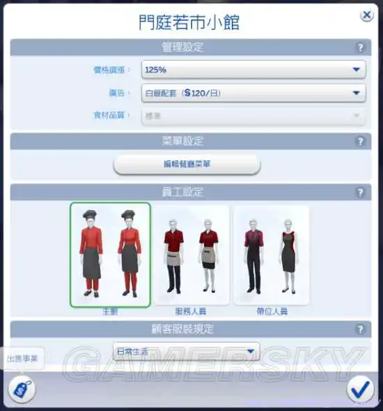 有了自己的餐厅之后,当然就是对自己餐厅作规划了了,你在这个管理面板可以设定商品价格,广告费用,员工服装样式,以及顾客服装类型,比如楼主就喜欢把顾客服装选为泳装
