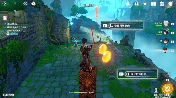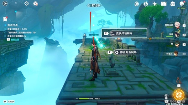 2.触碰大元素微粒,开启限时挑战,收集风元素微粒!先【停止附近风场】,再【变换风场朝向】,即可往上飞,拿到风遁币,并飞到对面平台!