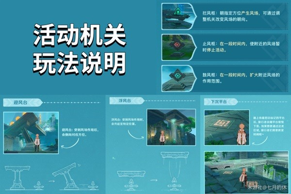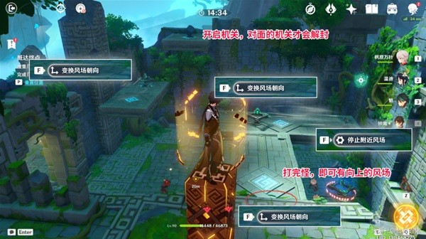 3.打完怪,出现风遁币,机关解封,出现向上的风场,飞上去,先【停止附近风场】,再把2个机关【变换风场朝向】各1次,飞到上面【开启】方块机关,对面的机关解封,再【变换风场朝向】,即可往上飞到平台!