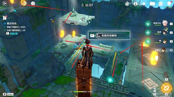 1.进入挑战,第一个机关不停风场也没事,可以直接拿,在箭头机关处,【变换风场朝向】,即可往上飞,拿到风遁币,并飞到对面平台!