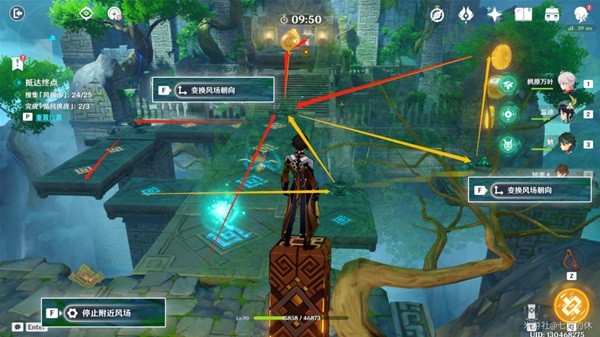 5.先【停止附近风场】,触碰大微粒,跟着红色箭头逆时针绕一圈,收集元素微粒,再跟着黄色箭头方向,借助机关向上风场飞上来,(如果跑的快,可以直接飞向右边),在中间的机关【变换风场朝向】,飞到右边,同样的操作,跟着红色箭头方向,再飞过来,然后往前走到终点即可完成台挑战!