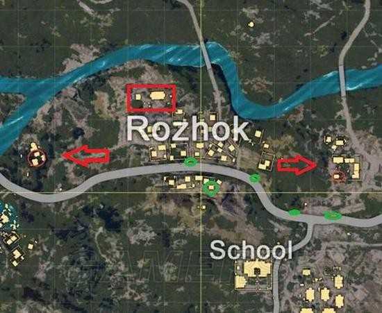 其次,红框所标的位置是整个R城中最为安全的高地。红框中有一栋可以上房顶的三层小楼,和一个大仓库。虽然和南边的房区相邻,但完全处于高地势,北边是条河,并且河对面也没有建筑,这就使得红框成了整个R城中最安全的位置,并且资源也足够单人发展。但正因如此,红框所在的高地并不安静。所以在多人落地的情况下,优先占领三层小楼,不要贪心直接去大仓库,一旦没有搜到枪,那等待你的就只有凉凉。所以前期在有人的情况下苟住,然后剩下的,就是步步为营,通过与南侧房区间的高度差来威慑整个R城。