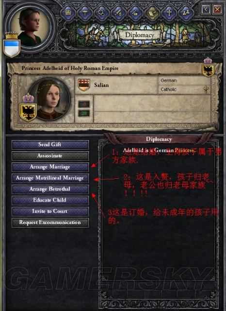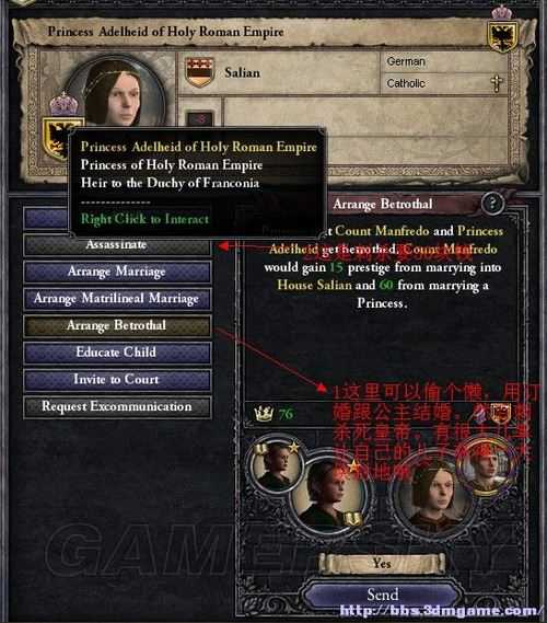 1这里可以偷个懒,用订婚跟公主结婚。然后刺杀死皇帝。有很大几率让自己的儿子获得一大块封地哦~~