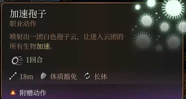 当队伍里有2个以上的输出手(例如两个大c+剑舞诗人)时,连成双加速也不能完全满足需求。但加速孢子在小范围内任何人都可以加速,只需要每个人每回合蹭一下孢子云的边缘。而且孢子德仅依赖于装备,对职业的需求只有2级德鲁伊,如果想要成双加速的话至少要3级术士1级法师+任一施法职业,或者5级术士,在职业等级消耗上面也非常轻量。