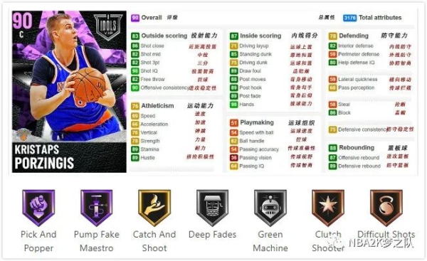 你们最爱的波神又来了,不过这张卡面我有点看吐了,2K就不能给帅波神换个造型吗...这张卡其实也没啥可说的,82三分、2米21的身高,顺滑的投篮手感,还有两枚投篮紫章(挡拆投篮手、假投大师),非常适合挡拆外弹战术。缺点也都是老问题了:速度慢、力量低,而且只能打中锋,反正喜欢波神的朋友也不在意这些,扔三分就完了。钻鞋推荐继续加三分,徽章可以升级几个投篮紫章。
