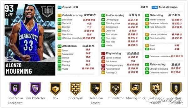 阿隆佐莫宁就是个纯粹的内线大闸,他的特点就是护框(盖帽95+篮板93)、对抗(力量94)和篮下终结(95站扣+96背身+96勾手),而且中投(82)也还可以,但三分(62)较差,不过速度(65)对于中锋还凑合,两枚紫章是背身防守者和护框精英,感觉可以一用。