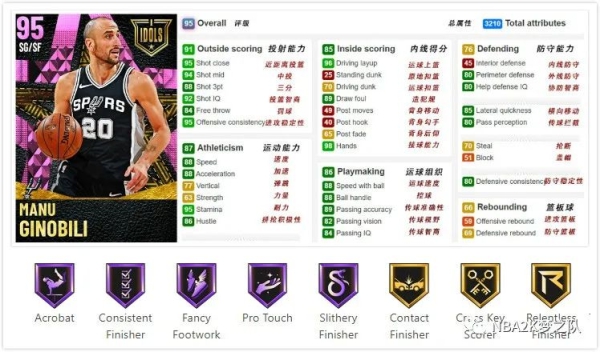 最后来看本次卡包中的最大牌偶像,粉钻马努!他有着和乔丹科比一样的身高(1米98),可以出任二号位和三号位。进攻方面,88三分+94中投,比紫乔科都更好的投射能力,然后96上篮搭配5枚冲框紫章(特技演员、节奏终结者、冲框大师、卓越手感、闪避终结者),让欧洲步可以重出江湖,不过他的扣篮要弱于乔科。