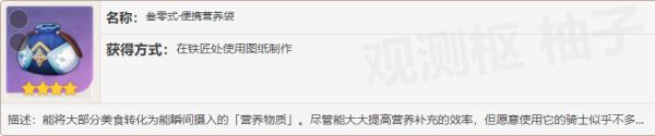 【蒙德声望等级5解锁】便携式营养袋:可以填充回复类或者buff类食物。恢复类食物能够一定程度上代替奶妈的位置,留给输出;增益类食物则能增加场上角色的输出能力。