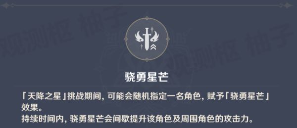 骁勇星芒:「天降之星」挑战期间,可能会随机指定一名角色,赋予「骁勇星芒」效果。持续时间内,骁勇星芒会间歇提升该角色及周围角色的攻击力。