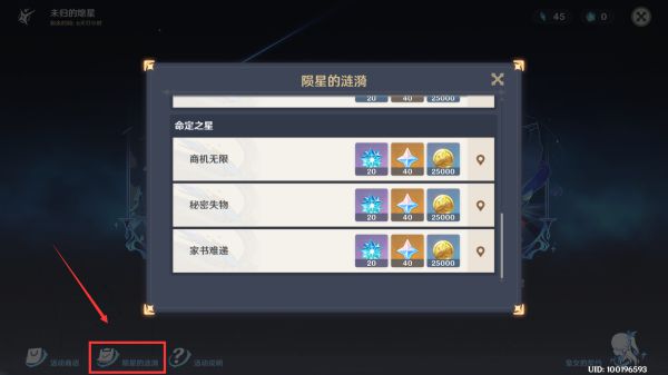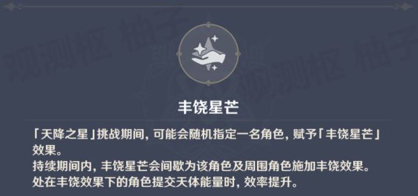 丰饶星芒:「天降之星」挑战期间,可能会随机指定一名角色,赋予「丰饶星芒」效果。持续期间内,丰饶星芒会间歇为该角色及周围角色施加丰饶效果。处在丰饶效果下的角色提交天体能量时,效率提升。